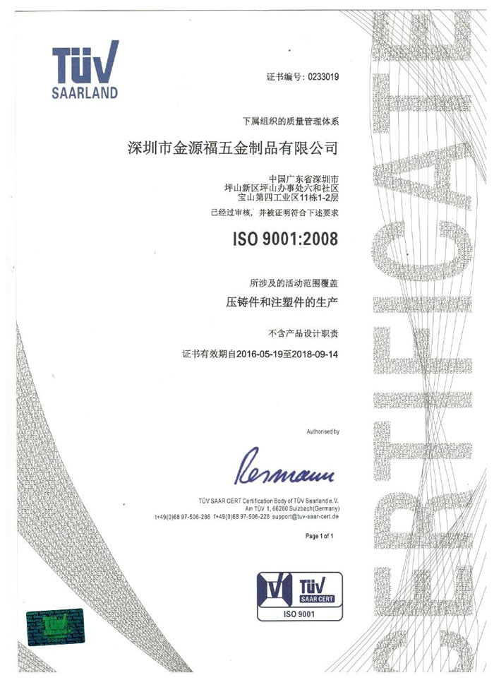 深圳市金源福五金制品有限公司成立于2003年。公司擁有8000多平方米生產(chǎn)廠地、開發(fā)與管理精英人才、技術(shù)專業(yè)、設(shè)備精良、交通便利、服務(wù)周全、具體設(shè)計(jì)、開發(fā)、制模、出樣、生產(chǎn)到成品出貨一體化模式生產(chǎn)廠家。已通過ISO9001:2008ISO1440/TS16949:2009國際質(zhì)量體系認(rèn)證。專業(yè)生產(chǎn)鋅合金壓鑄、鋁合金壓鑄產(chǎn)品、汽車配件、汽車后視鏡支架、車載導(dǎo)航散熱器、LED散熱器、LED燈罩、數(shù)碼電子五金結(jié)構(gòu)件、家具五金裝飾件、標(biāo)牌(LOGO)等五金壓鑄產(chǎn)品。
